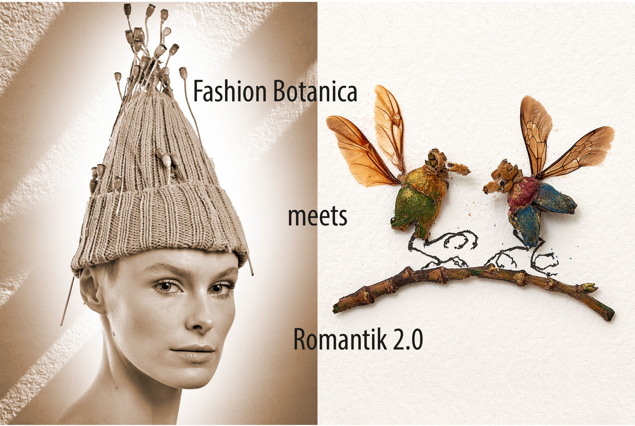 Pia has enhanced the fashion pieces and accessories with plant parts to create wearable art. In the exhibition space, the dress dolls conveyed what my works on the walls showed: the bizarre and the beautiful belong together! Carrying out the preparations and the entire event in pairs was an absolutely successful experiment. We laughed a lot together. Not just the two of us, but also the many good-humored guests, some of whom were invited and some of whom came spontaneously. The atmosphere is perfectly captured in this clip, which you can find under the link on YouTube. (Excerpts courtesy of timmedia, photos by Manfred Hohlweg)