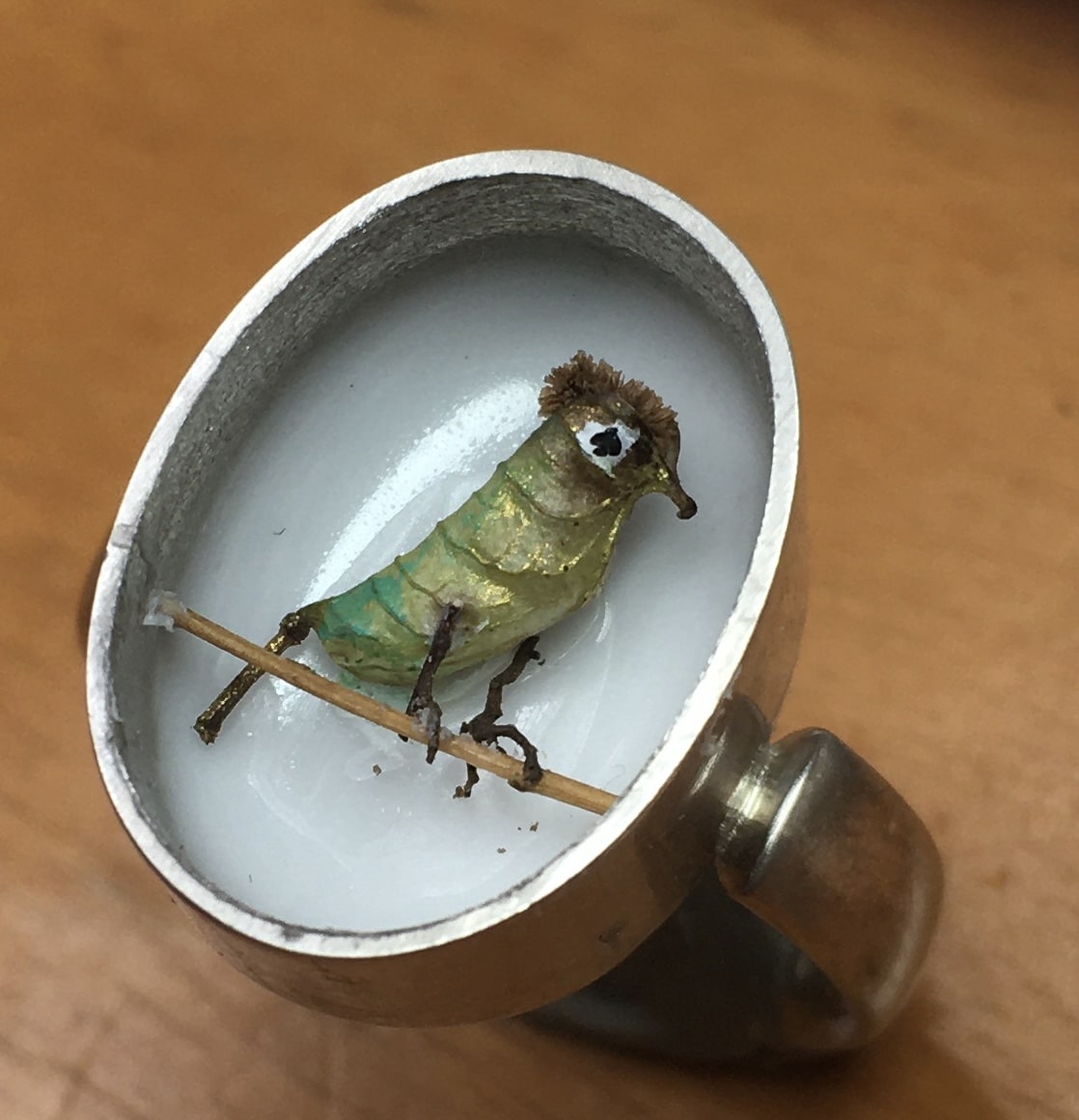 In collaboration with Anne Zimmer, I create small, fine, unique pieces of jewelry. This time it was a ring. The bird was created from a seed pod of an ornamental grass. It has a bit of a resemblance to a budgerigar, doesn’t it? When I processed the pod, the seeds fell out. I glued one of them back on at the top as a little tuft. So this could also be a cockatiel. That’s the way it is in free art – there is room for interpretation 🙂