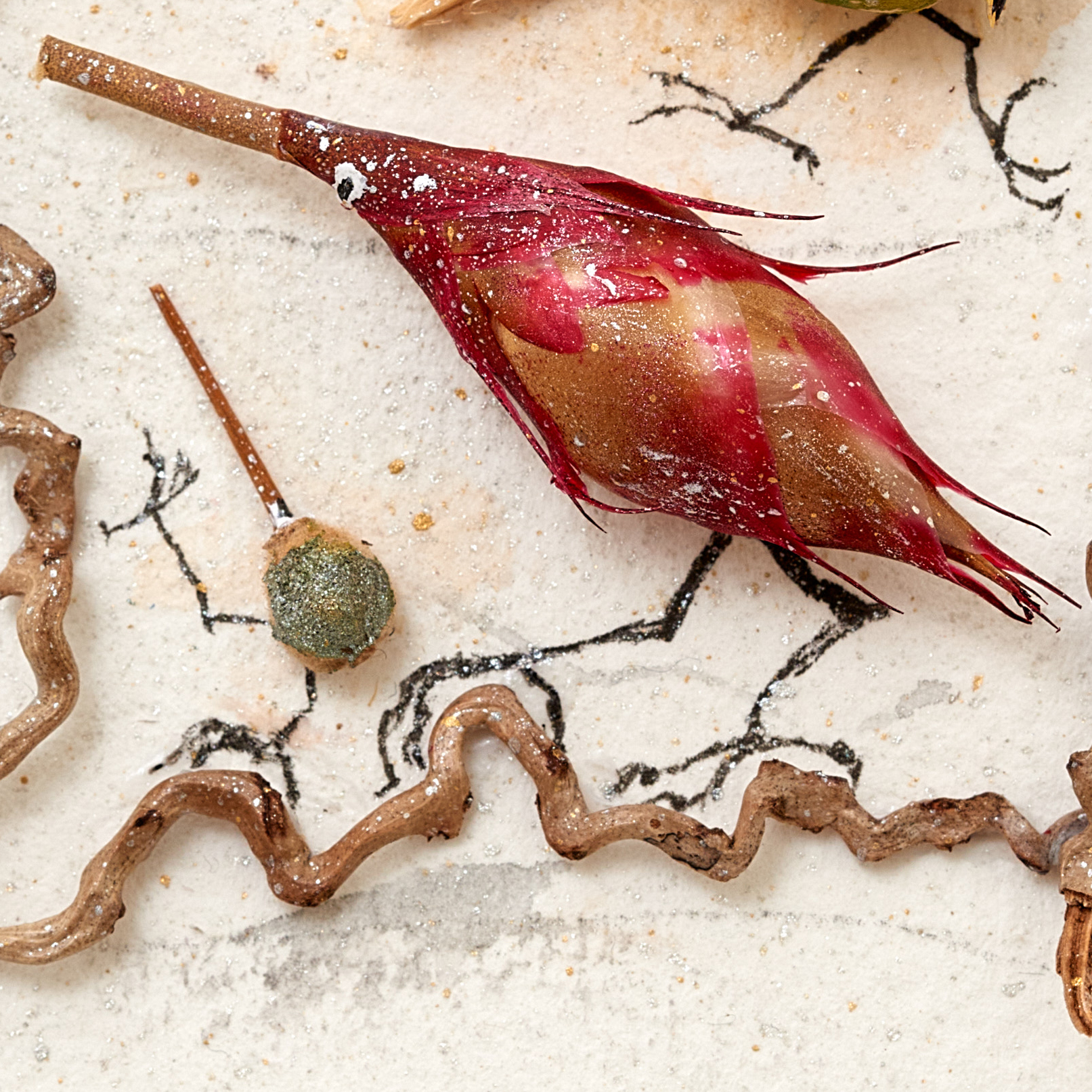 I’m a star! shows a small artist’s scene in which a bright red starling dominates the action. Originally an ornamental grass, this figure has found its place in a densely packed refuge. Between fine palm branches, it shares the space with a poppy booby and a barbary sparrow.