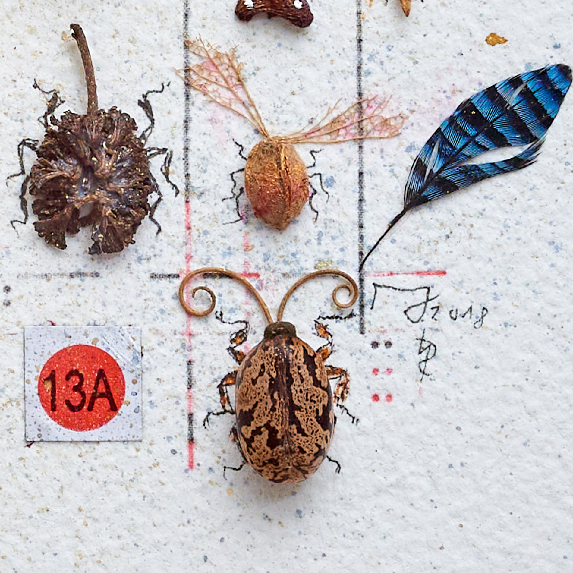 In this work, plant remains and small pieces of waste are combined to create a new, fictitious habitat. Pine cone scales, berries, palm seeds, beans, fragments of coneflower, flower remains and grasses colonize an artistic habitat between mirror fragments, a jay’s feather, a fragment of a butterfly wing and small pieces of paper and metal waste.