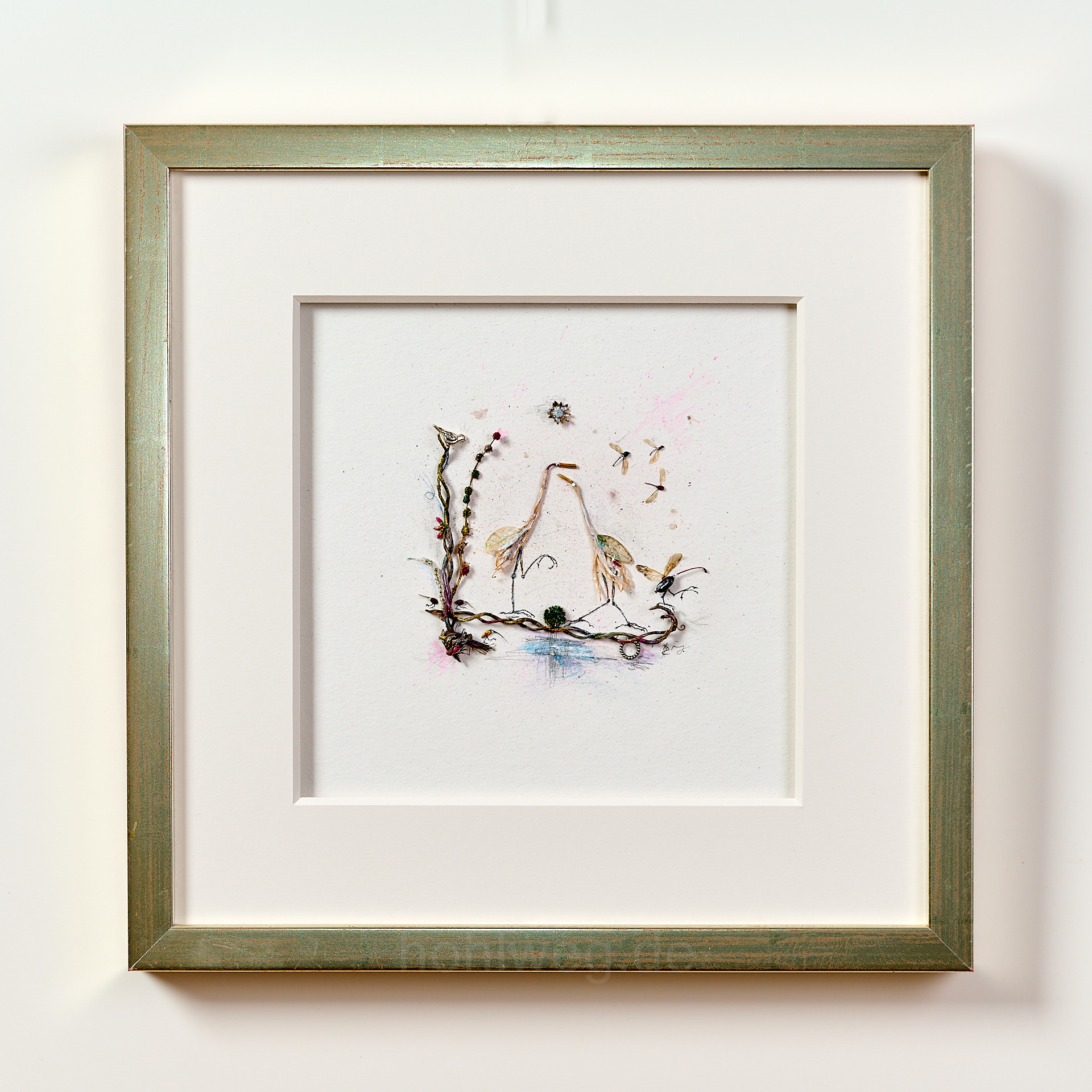 Bei diesen Gestalten aus getrockneten Blüten musste ich an Silberreiher denken: Mit ihrem eleganten Federkleid stechen sie aus der tristen Landschaft hervor und waten gemessenen Schrittes durchs Schilf. Oder tanzen sie vielleicht Tango? Vielleicht wissen es die kleinen Teichhühner, die sich am unteren Rand der Szene im knorrigen Ufergehölz tummeln.