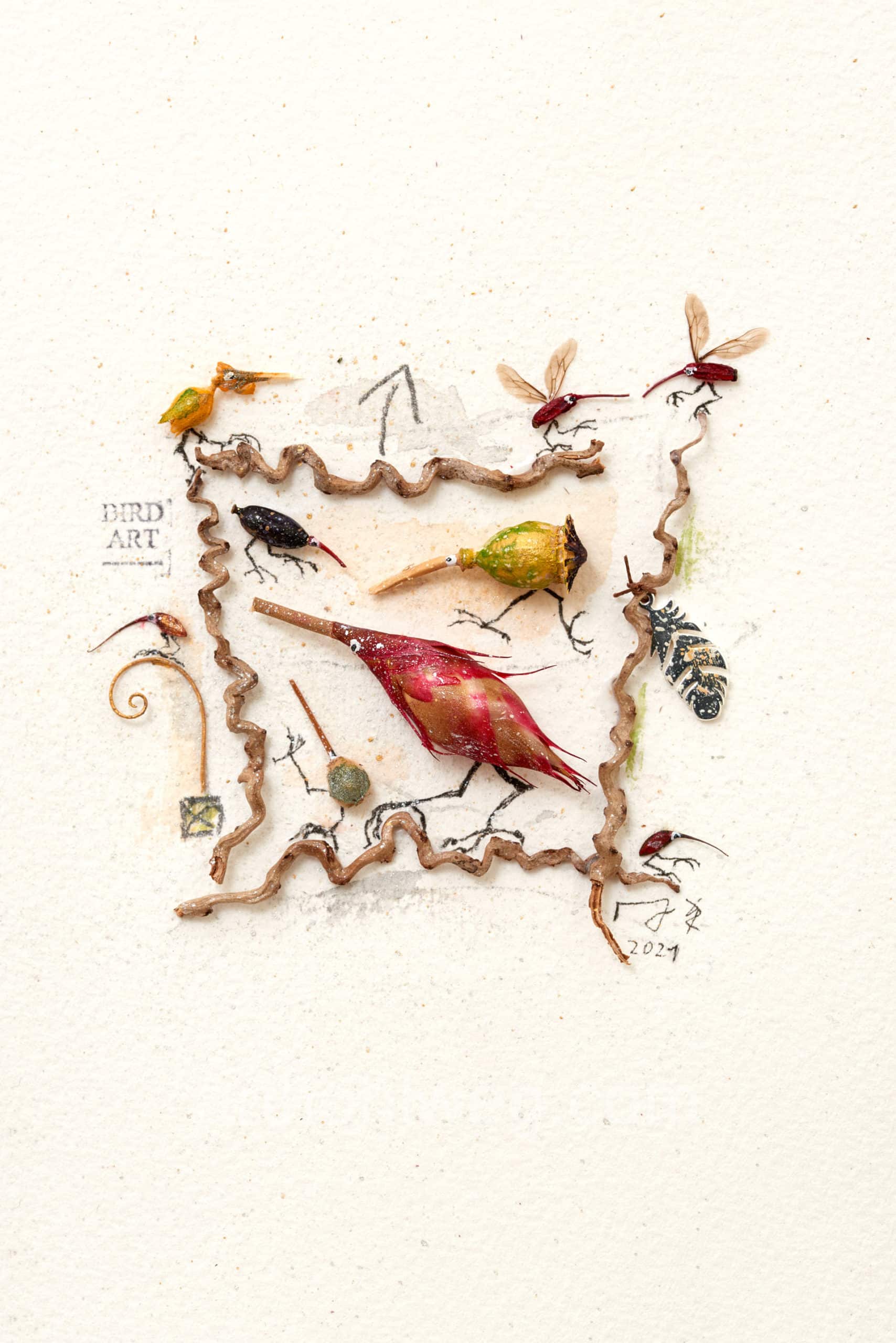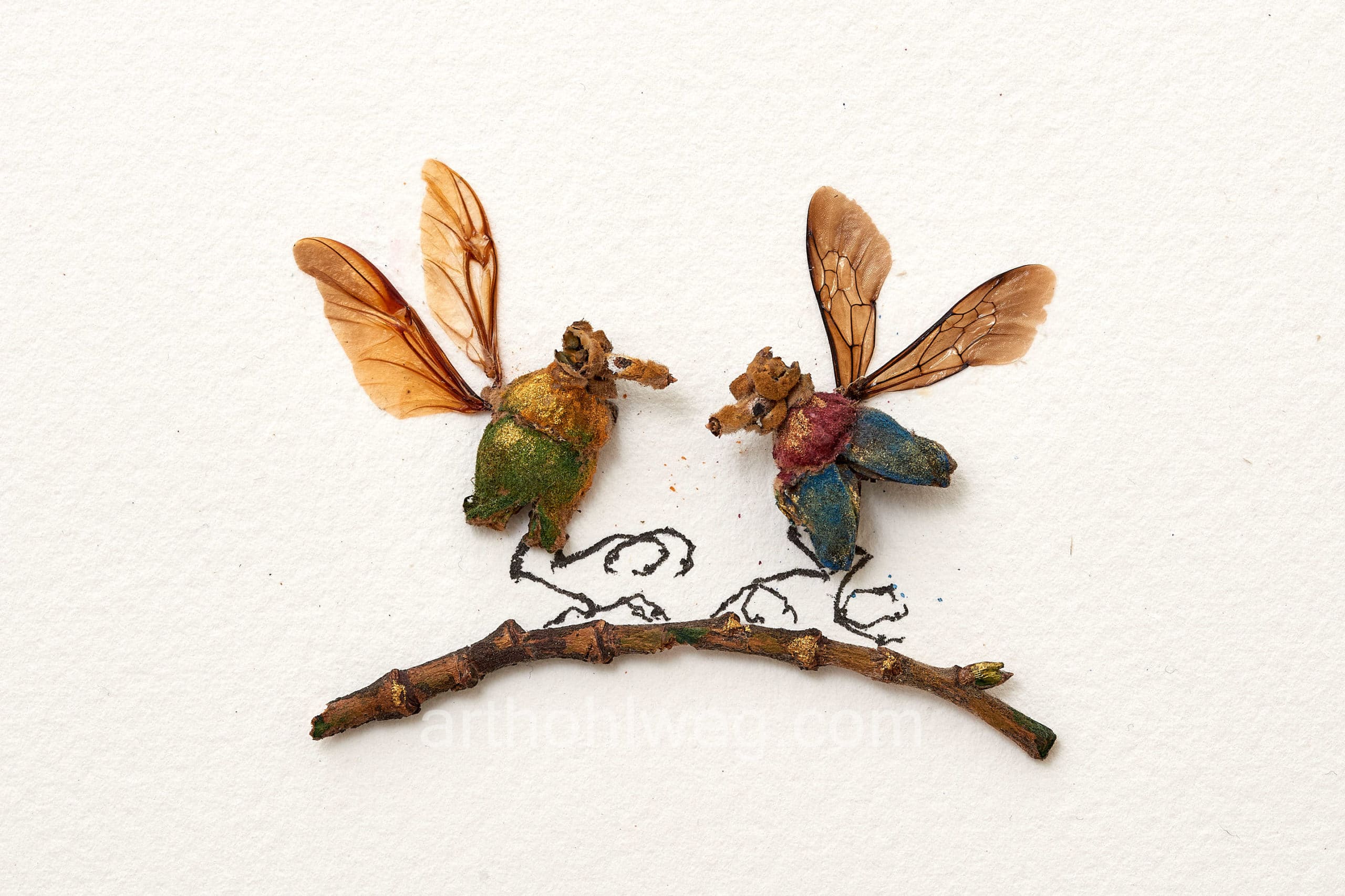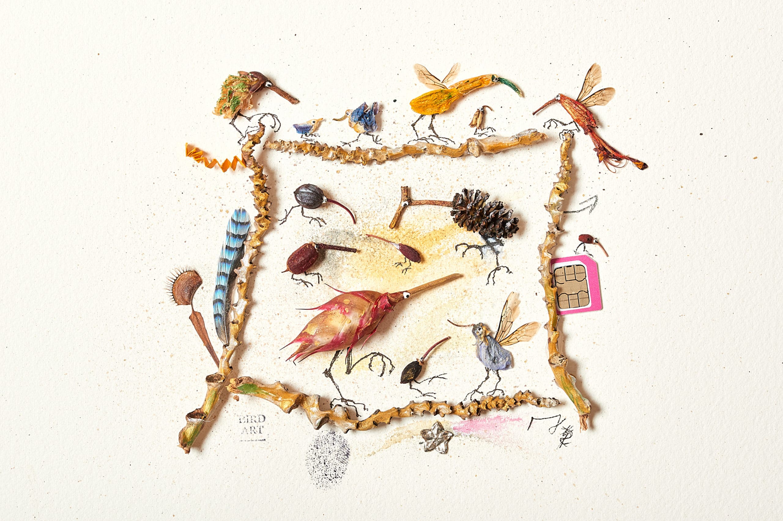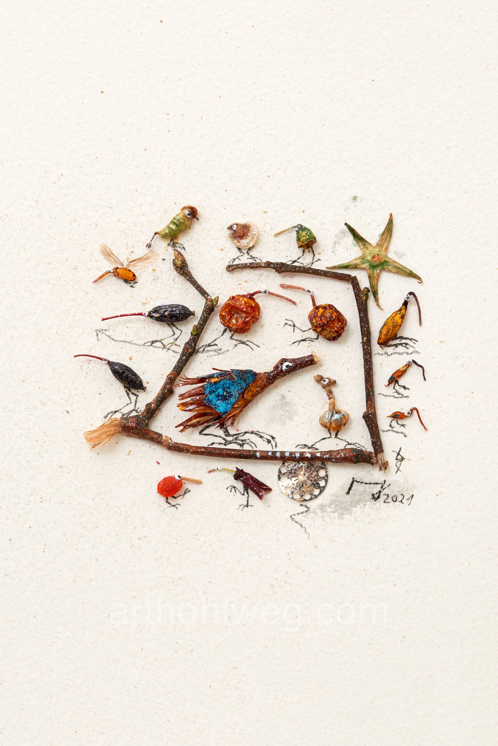 Diese Sammlung ist wie ein kleiner Spaziergang durch die [UN]scheinbaren Welten meiner Collagen. Die Fotos sind übrigens mit ziemlich großem Aufwand entstanden. Denn jedes Bild besteht aus mehreren übereinander gelegten Fotos. Für eine ausreichende Schärfentiefe der Macroaufnahmen haben wir das sehr gern gemacht. Nun können Sie auch wirklich jedes Federchen, jeden Zausel in den quirligen Miniaturszenen genauestens betrachten. Bitteschön. Die Größe jeder Karte beträgt 10 x 15 cm. Drei der Motive sind im Querformat abgebildet, sieben im Hochformat. So konnte ich alle Charaktere bestens in Szene setzen. Das Zehnerpack erhalten Sie in einer ansprechenden Geschenkbox.