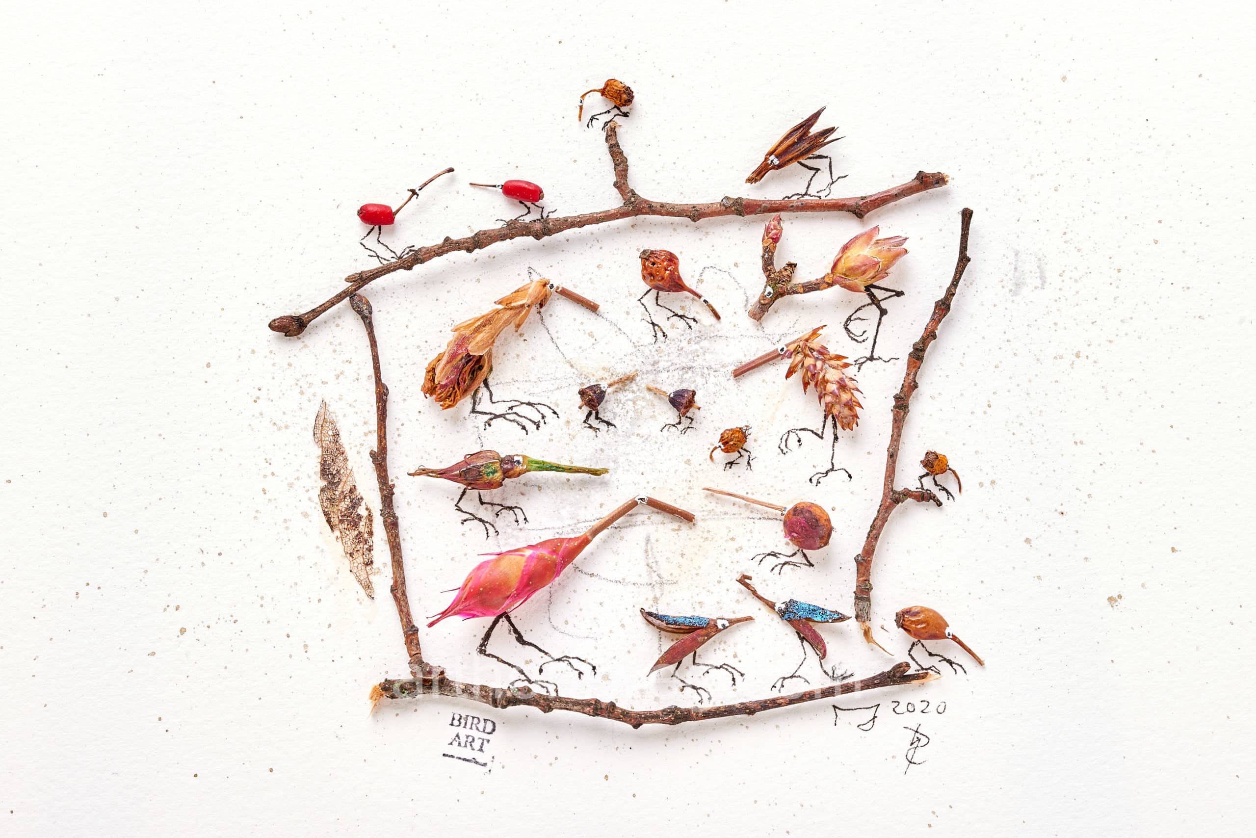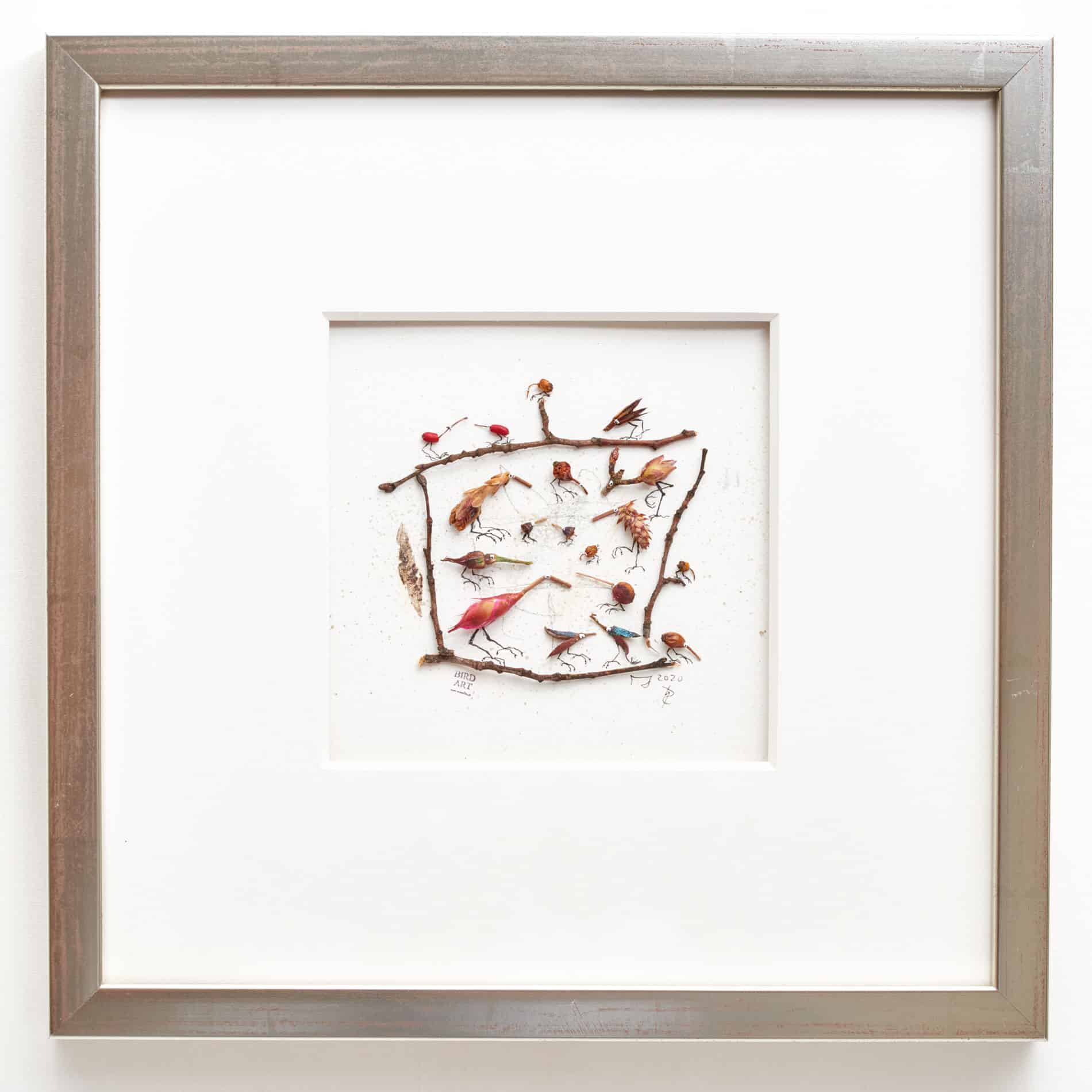 Miniaturcollage im Objektrahmen der Größe 30 x 30cm. Allerlei bizarre Pflanzenrestchen werden umgedeutet zu eigenwilligen Vogelgestalten, die in ihrem Mikrokosmos ein unvermutetes Eigenleben führen, in diesem Falle in Reisigabschnitte eingefasst auf etwa 10 x 10cm.